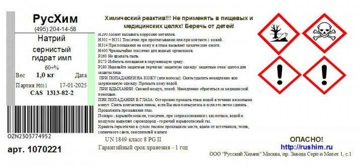 Отходы сернистого натрия у потребителя подлежат обезвреживанию в соответствии с документацией, утвержденной в установленном порядке.
